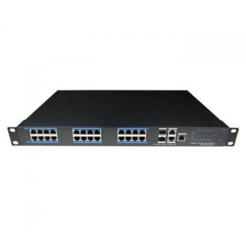 24-портовый управляемый PoE коммутатор, имеет 24 гигабитных Ethernet порта с поддержкой PoE, 2 гигабитных Uplink Ethernet порта, а также 2 гигабитных оптических разъема для SFP модулей. Коммутатор поддерживает PoE стандартов 802.3 af/at ,управление Web layer-2
